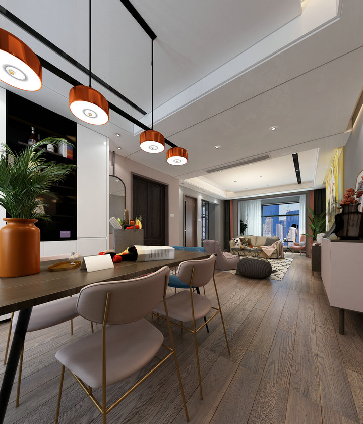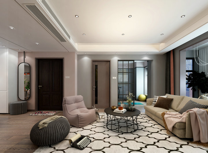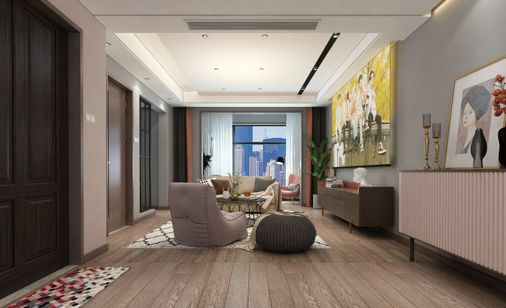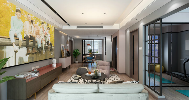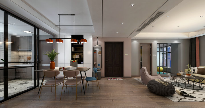 看膩了極簡空間的黑白灰,厭倦了北歐風的木與白,是時候給家增添一抹甜蜜粉色了~ 白+粉似乎一直是一對友好的cp,在這個以粉色為基調(diào)的空間里,從大面積的墻體背景,到單品的家具、靠枕、裝飾畫,都不斷的呼應著,而白色的定制柜與深灰色沙發(fā),則起到了一個很好平衡作用。這是一個柔和的感性色彩空間,粉色將其飽和度降低,像一顆草莓融化在了奶油里。 可它又是一個理性的空間,運用了許多黑、灰元素將室內(nèi)達到一種舒適的平衡,讓空間更顯得高級。而木質(zhì)、絲絨、金屬、壁畫等肌理的加入更是豐富了其中的層次感。不僅滿足了視覺上的享受,也在觸感上帶來意外的驚喜。粉色作為基調(diào)也一直延續(xù)著,很巧妙的在沉穩(wěn)與俏皮中尋求平衡,匠心獨運。