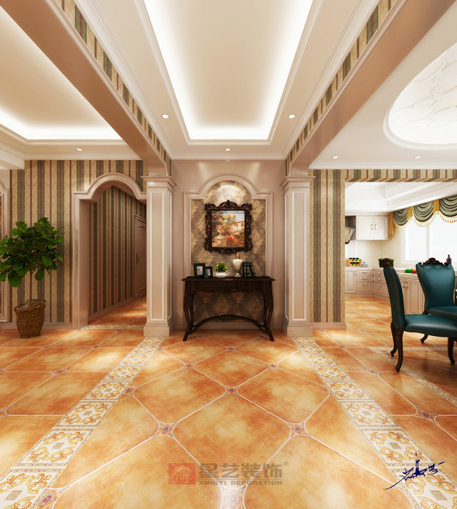 本案一進門處做了玄關造型,頂、地、墻,協(xié)調統(tǒng)一,