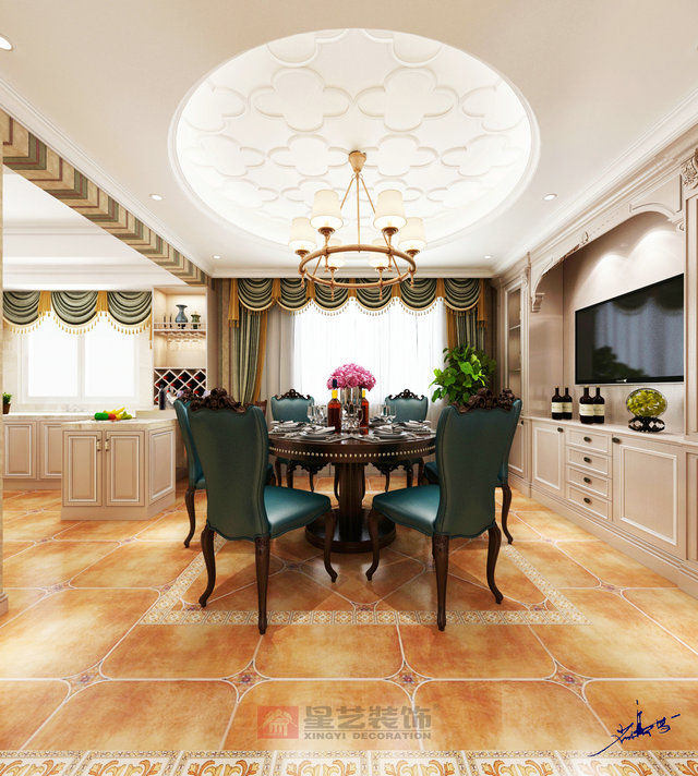 餐廳:餐廳與廚房一體的全開放式,寬敞明亮,實用大氣。右手處一面墻的餐邊柜實用性與美觀性一體滿足了女主人的儲物需求與男主人收藏酒水的習慣,八人圓餐桌違和感實足濃濃家的氛圍在這里更為濃郁.