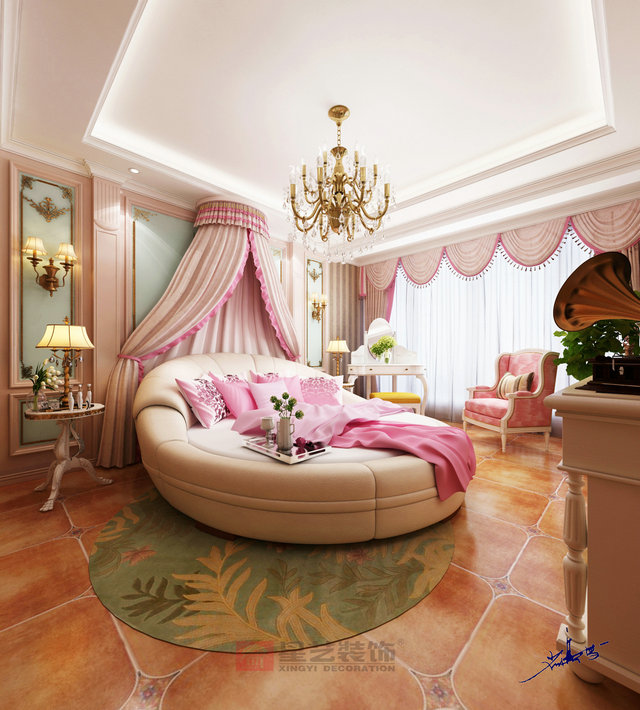 女兒房:香粉色紗幔與香檳色的護墻板彰顯公主的身份,可愛不失高貴,精致的圓床溫馨細膩,安全感實足。