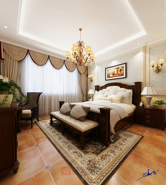 主臥室:厚重的實木床高貴端莊,裸色的護墻板提亮了整個空間,不那么沉悶,精致優(yōu)雅。