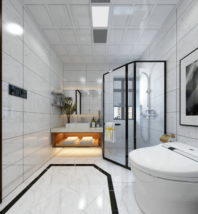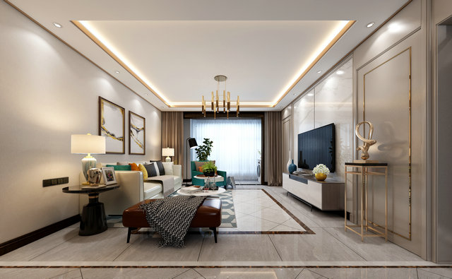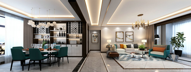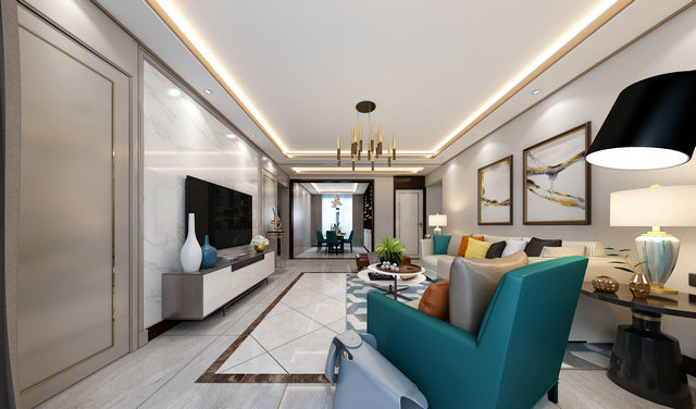 藍綠色作為空間的主題色,在空間中得到充分體現(xiàn)。600*1200灰色石材紋理地磚覆蓋整體空間,紋理本身成為裝飾的一部分。質感輕奢的皮質沙發(fā)是客廳的視覺中心,輕松閑適的氛圍也給人以生機勃勃的力量。