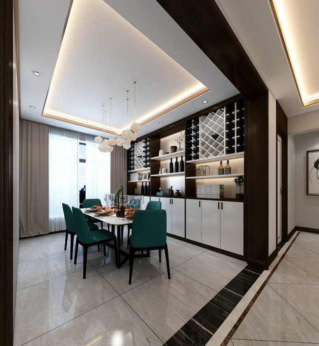 餐廳延續(xù)了客廳的藍綠基調,定制設計的不銹鋼與大理石組合的餐桌、木質布椅、套色的酒柜等,為空間增添更多趣味的元素,傳遞出主人不拘泥于常規(guī)、努力求變的生活態(tài)度。
