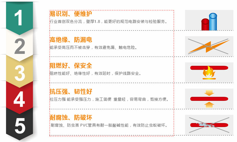 行業(yè)首創(chuàng)雙色電工套管 ,根據(jù)星藝裝飾標(biāo)準(zhǔn)工藝的要求:為了更好的規(guī)范電路工程,確保工程品質(zhì),及監(jiān)理與業(yè)主對電工項目的檢查與驗收,采用優(yōu)質(zhì)的阻燃型有色PVC 塑料管作強(qiáng)、弱電線保護(hù)管材。紅色——強(qiáng)電及照明用電專用,藍(lán)色——弱電項目專用。
