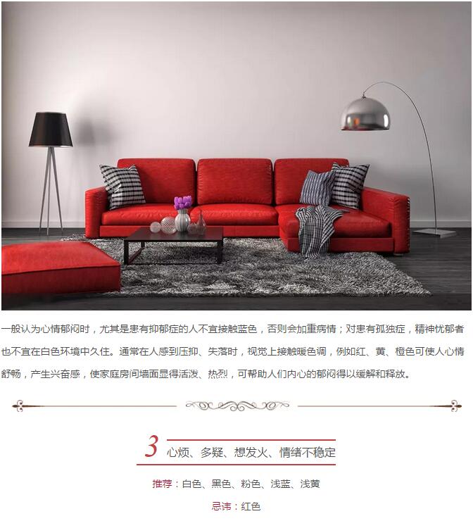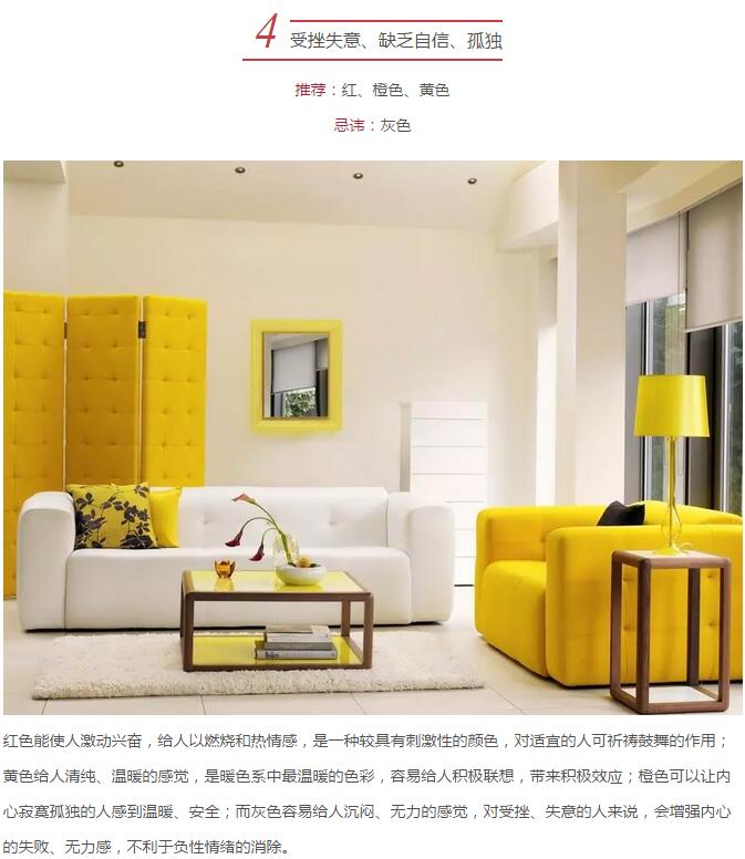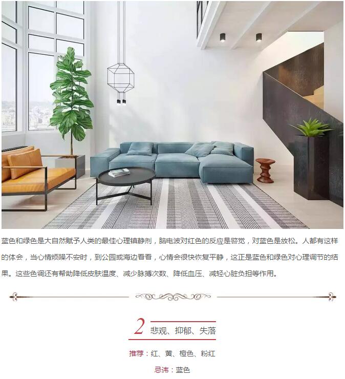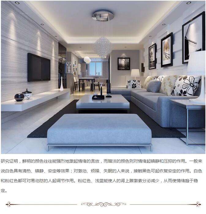 美學家通過研究多人的行為研究發(fā)現(xiàn),猶如維生素能滋養(yǎng)身體一樣,色彩會直接或間接地影響人的情緒、精神和心理活動。不同色彩通過人的視覺反映到大腦中,除了能引起人們產(chǎn)生陰暗、冷暖、輕重、遠近等感覺外,還能產(chǎn)生興奮、憂郁、緊張、輕松、煩躁、安定等心理作用。家裝中選擇適宜的顏色,能賦予家居環(huán)境更多的時尚格調(diào)和舒適氛圍。